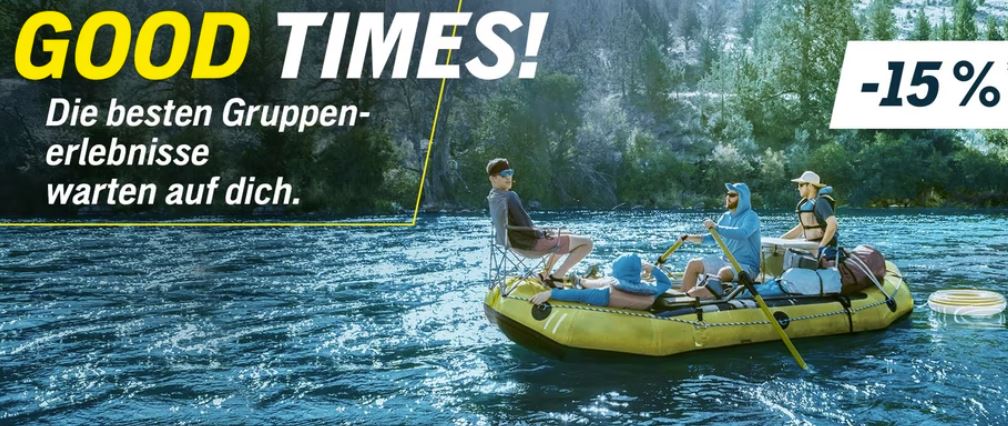 - Sichert euch in regelmäßigen Abständen bis zu 20 Prozent Rabatt auf ausgewählte Kategorien oder Erlebnisse. Ihr seht die Aktionen hier oben in der Auswahl oder erfahrt davon auf der Startseite des Erlebnisportals.