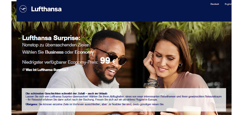 - Nutzt den Link “Angebote und Destinationen”, um euch aktuelle Aktionsflüge anzeigen zu lassen. Last Minute Schnäppchen oder Frühbucher Rabatte sind auch bei der Lufthansa zu kriegen.