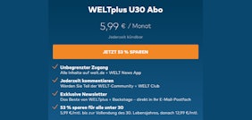 | 53€ Rabatt | WELTplus Monatsabo für 5,99€ statt 12,99€ bis zum 30. Geburtstag | Bis auf Widerruf |