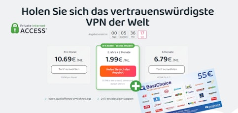 - 2 Jahre + 2 Monate PIA (Private Internet Access) VPN für 51,74€ + 55€ Prämie geschenkt über unsere Bonusdeals