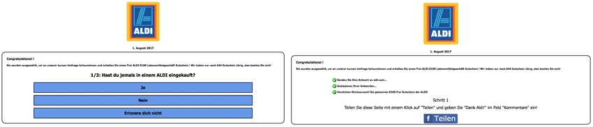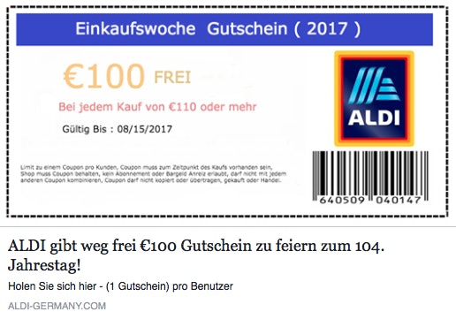 - gefälschter 100 Euro Aldi-Gutschein bei Facebook für Umfrage