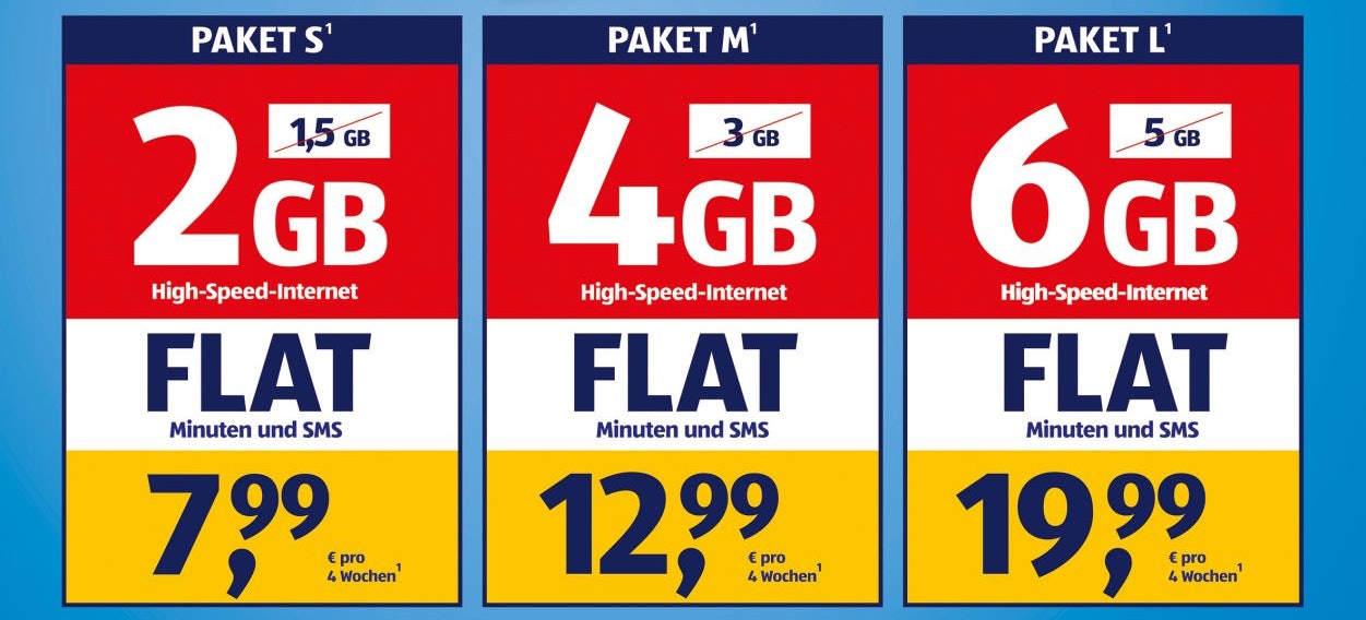 Im Detail hebt Aldi Talk das Datenvolumen bei den betroffenen Paketen um 500 Megabyte beziehungsweise 1 Gigabyte an. Unverändert bleiben die Internet-Flatrates S und M mit 500 Megabyte und 1 Gigabyte Datenvolumen.