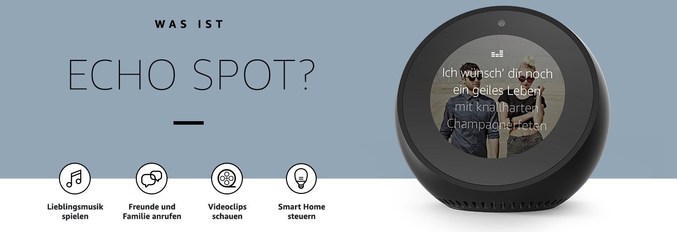 „Platziert auf Schreib-, Nacht- oder Beistelltisch zeigt Echo Spot per Sprachbefehl Nachrichten, Wettervorhersagen oder Live-Feeds von Sicherheitskameras, tätigt Videoanrufe und bietet Zugriff auf Tausende Alexa Skills.“ – Amazon
