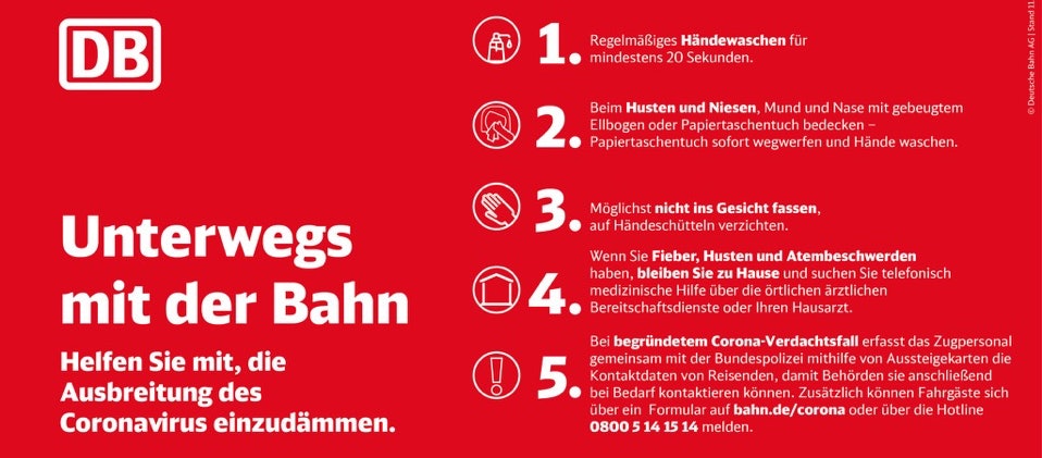 Generell verweist das Unternehmen auf die Einhaltung von Hygieneregelungen, um die Ausbreitung des Lungenvirus zu reduzieren. Zusätzlich wird ein Merkblatt sowie eine Fahrgast-Information angeboten.