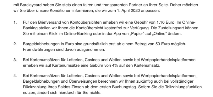 Die Änderungen der Allgemeinen Geschäftsbedingungen treten zum 1. April 2020 in Kraft. Für Inhaber der Baclaycard New Visa sin die neuen AGB mehr oder weniger nachteilig. Der erhöhte Kartenumsatz für Lotterien, Casinos, Wetten und Wertpapierportale dürfte eine relativ kleine Nutzergruppe treffen. Auch die Erhebung von Zinsen für diese Transaktionen ab dem ersten Buchungstag kostet dürfte nur einen kleinen Kreis an Nutzern treffen. Dazu lassen sich die neuen Kosten durch andere Zahlungsmittel oder -arten umgehen.