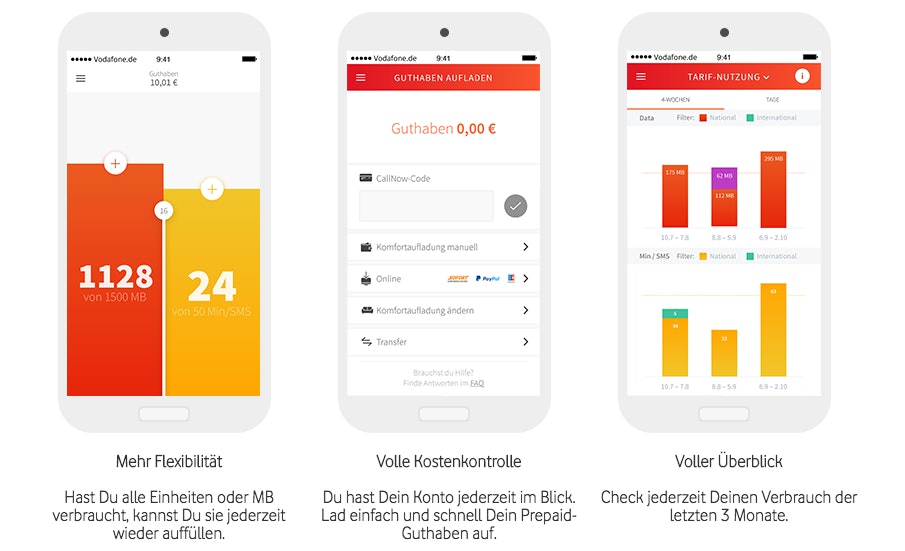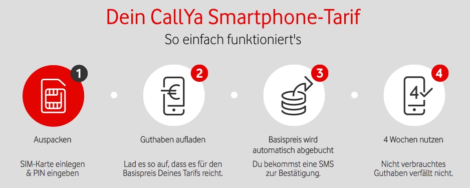 Für CallYa Flex jede Vodafone-Prepaid-Karte geeignet. Wer also bereits einen Tarif ohne Vertragslaufzeit bei dem Unternehmen nutzt, kann einfach auf das neue Angebot umsteigen. Dafür wird lediglich die App benötigt. Das Smartphone-Programm steht sowohl für Android als auch für iOS zur Verfügung. Wer lieber wieder auf einen anderen Tarif zurückwechseln will, kann das wie gewohnt tun. Das Guthaben lässt sich via PayPal, Kreditkarte und Sofortüberweisung aufladen. Wer eine CallYa-Karte neu bestellt wird durch die nun geltende Ausweichpflicht bei Prepaid-Tarifen per VideoIdent identifiziert.