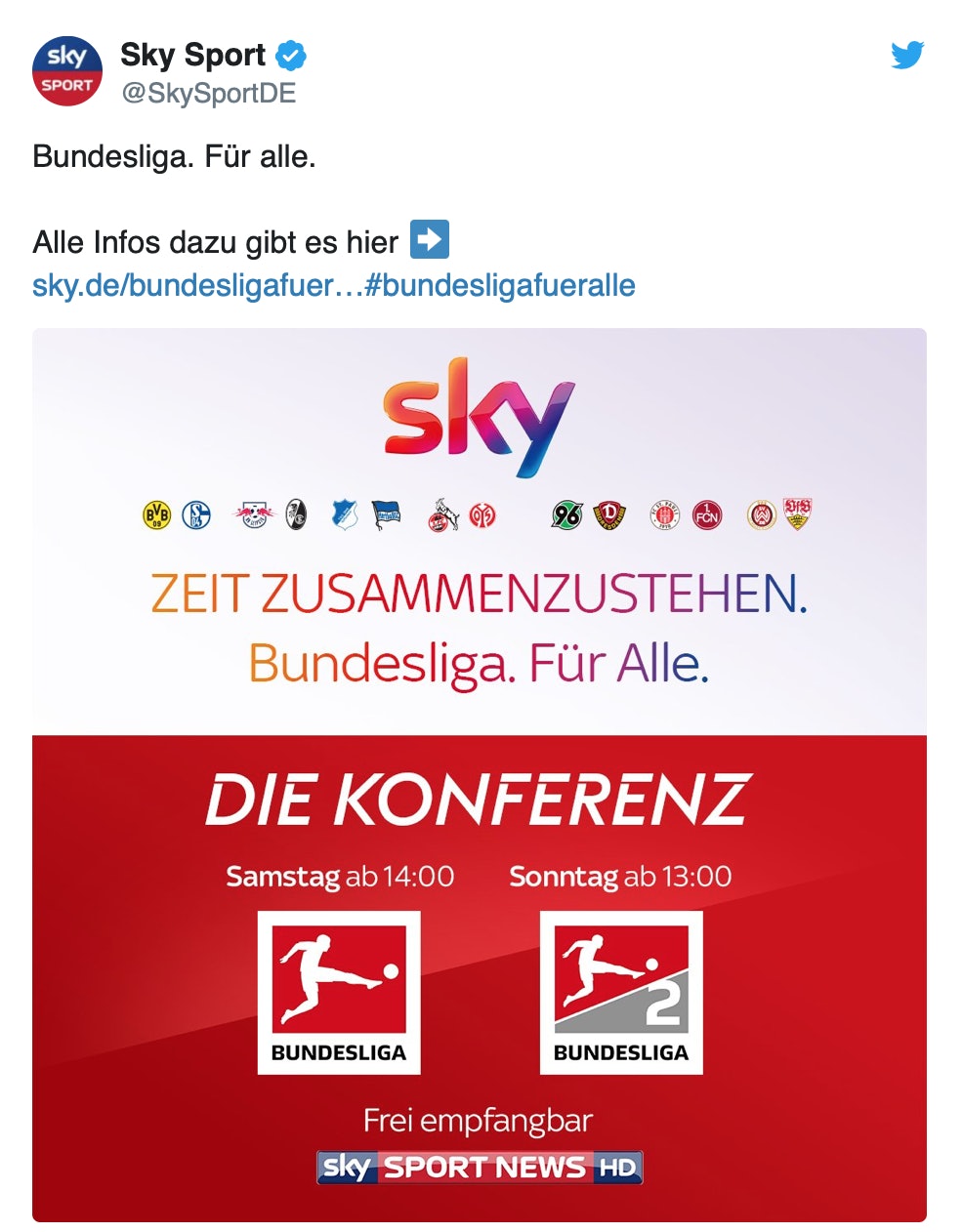 Des Weiteren verkündete der Pay-TV-Sender, dass es auch für den Rest der Saison „weitere attraktive Sky Angebote sowohl für neue als auch bestehende Kunden“ geben wird.