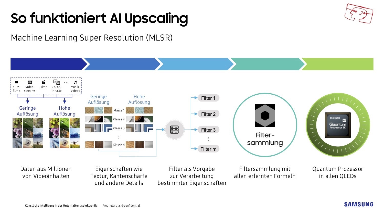 So richtig Intelligent ist diese Technik noch nicht. Für den Quantum-Prozessor hat Samsung acht Millionen Filmsequenzen ausgewertet. Auf dieser Grundlage wurden Filter entwickelt, die das niedrig aufgelöste Bild möglichst optimal anpassen. Der Chip vergleicht dafür das aktuelle Bild mit einem UHD-Referenzbild bis der optimale Filter gefunden wurde.