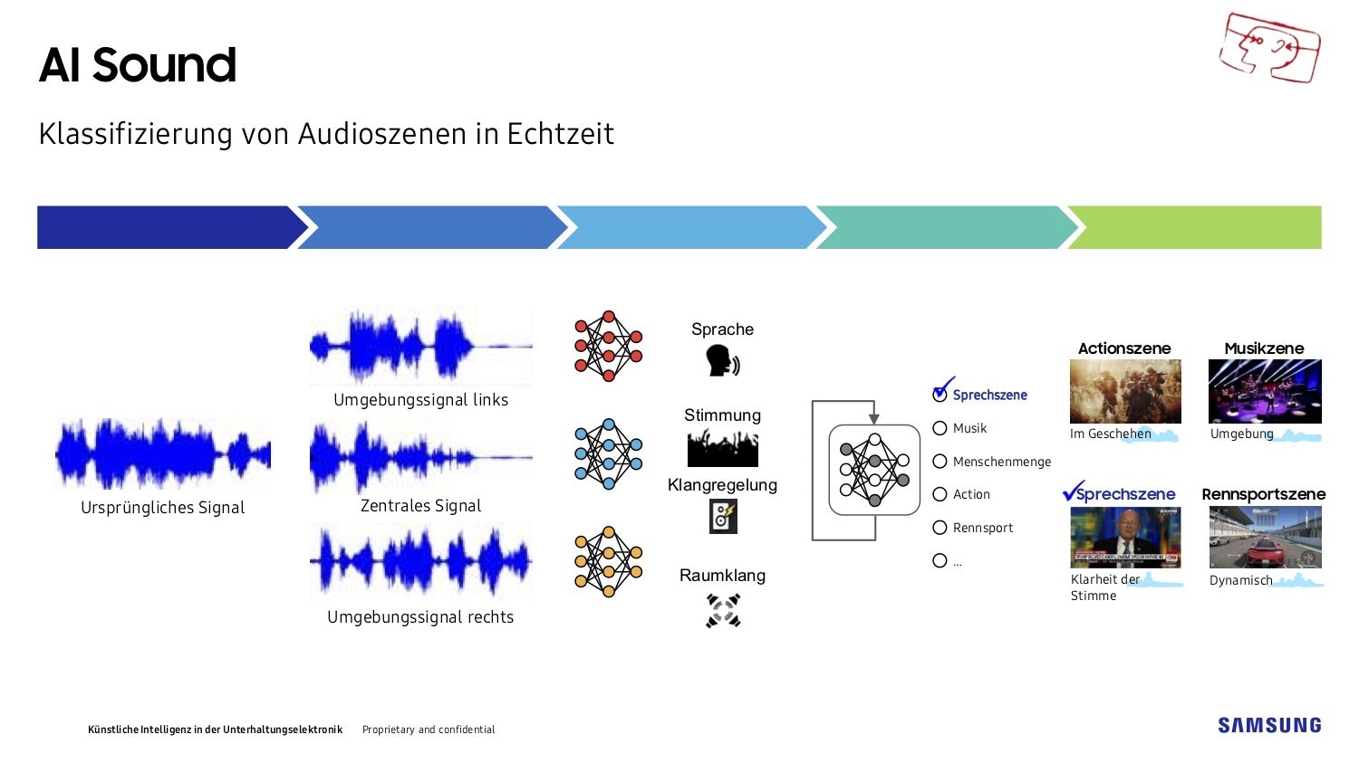 Der nächste Schritt ist die Verbesserung des Tons. Wie auch beim Bild werden hierfür Tonsequenzen analysiert, welche der Prozessor mittels KI vergleicht und so die passenden Einstellungen wählt. Der Lautstärkewechsel zwischen lauten und leisen Szenen könnte vorbei sein. Das ist auch dadurch möglich, weil der Fernseher sich an die Sehgewohnheiten des Zuschauers anpasst. Noch ist das eine Zukunftsversion, doch ein Anwendungsfall mit guten Aussichten auf eine Umsetzung.