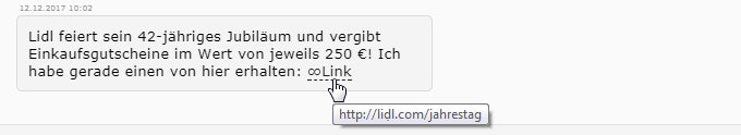 Die fingierte Hintergrund-Story des Lidl Fake Gutscheins ist annähernd die gleiche wie bereits beim Aldi Fake Gutschein:. Lidl hat Geburtstag, genauer gesagt feiert der Discounter 42-jähriges Jubiläum und verschenkt deshalb Lidl Einkaufsgutscheine im Wert von 250€ – angeblich. Unter dieser wohlklingenden Überschrift wird auf WhatsApp die Nachricht eines angeblich bereits erfolgreichen Nutzers verbreitet, der sich bereits einen Lidl Gutschein gesichert hätte. Dazu müsse man lediglich auf den angehängen Link klicken.