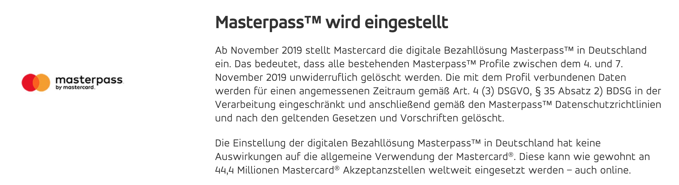 - ab November 2019 wird Masterpass nicht weiter angeboten