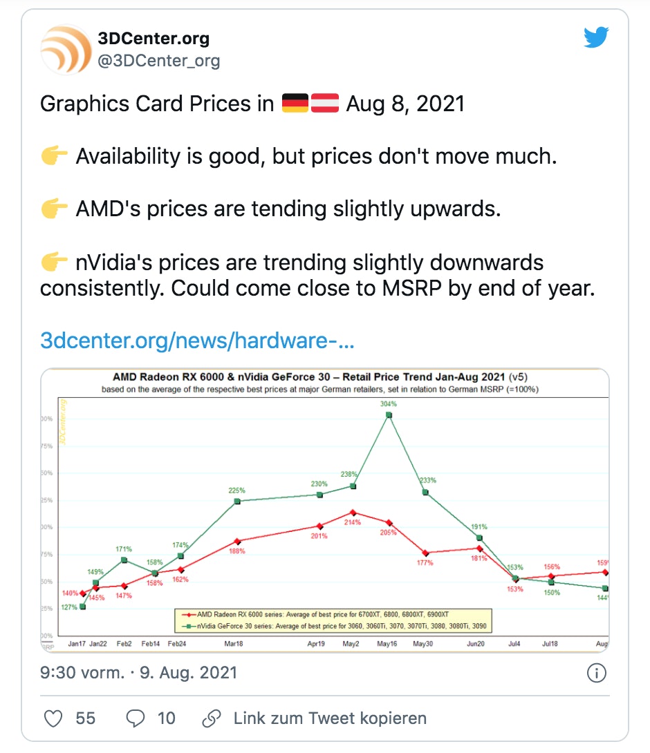 Einer Preisprognose von 3DCenter zufolge könnte dieses Problem bald der Vergangenheit angehören. Die Auswertung aktueller Statistiken lässt darauf hoffen, dass die Straßenpreise der begehrten und für Spiele unerlässlichen Utensilien bald den UVPs entsprechen könnten. Im Falle von AMD hingegen könnte sich die Anpassung noch etwas länger hinziehen, da deren Grafikkarten noch schwieriger zu ergattern sind, als die Konkurrenzmodelle. Die auf Twitter gepostete Grafik der Experten schürt zwar Hoffung und fußt auf verlässlichen Daten – aktuell sind die Preise aber noch meilenweit von der Prognose entfernt und liegen mitunter 50 Prozent über den gelisteten.