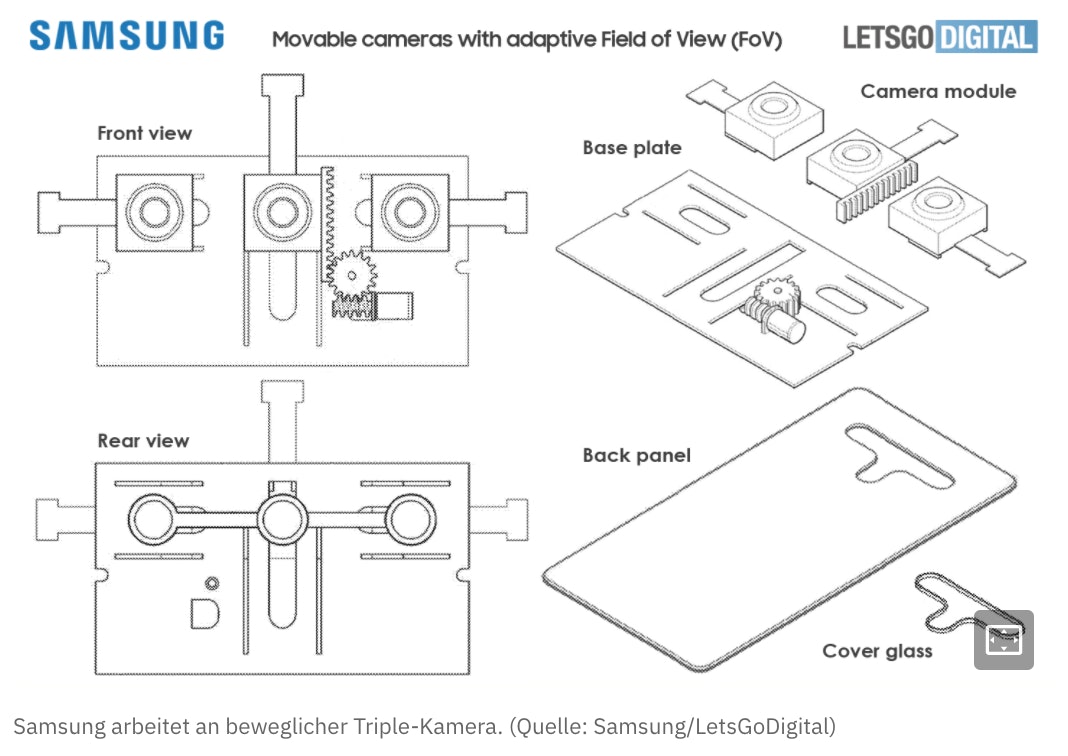 Einem Patent zufolge hat Samsung eine Triple-Kamera in der Pipeline, welche beweglich im Gehäuse verbaut ist. Mithilfe von Zahnrädern können sich die drei Sensoren in Form eines Dreiecks umeinander bewegen. Dadurch soll laut der folgenden Patentskizze nicht nur die Blende, sondern auch das Blickfeld verändert werden können, wie Letsgodigital berichtet.