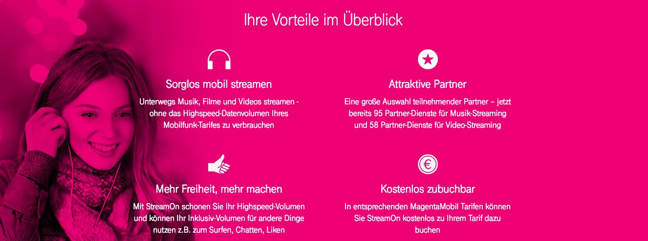 StreamOn ist eine kostenlose Option der Telekom. Unterstützt wird das Streamen von Musik- und Videoangeboten. Kunden können das Angebot von sogenannten Content-Partnern nutzen, ohne das die Datenmenge auf das Internetvolumen des Tarifs angerechnet wird. Mittlerweile sind die wichtigsten Musik- und Videoanbieter mit StreamOn verfügbar. Dazu kommen zahlreiche Rundfunksender und Medienanbieter. Im Rahmen der Überprüfung durch die Bundesnetzagentur hat die Telekom dazu mitgeteilt, dass ab dem 1. März 2018 auch Privatpersonen Partner bei StreamOn werden können. Auch Downloads sollen dann mit StreamOn möglich sein.