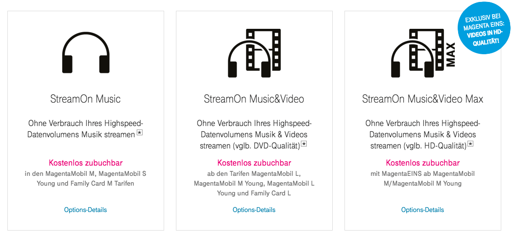 Bemängelt wird allerdings die Gestaltung. Je nach Mobilfunk-Tarif unterscheidet sich der Umfang von StreamOn. Das Streaming von Musik wird bei StreamOn ab den Tarifen MagentaMobil M beziehungsweise MagentaMobil S Young nicht auf das Datenvolumen angerechnet. Bei Video geht es ab MagentaMobil L oder MagentaMobil M Young los. Die Bildqualität entspricht in diesem Fall aber nur DVD-Qualität. Die maximale Auflösung gibt es nur für MagentaEins-Kunden, die zum Beispiel noch einen Festnetzvertrag zusätzlich besitzen. Gerade die Unterscheidung beim Video-Streaming missfällt den Wettbewerbsschützern.