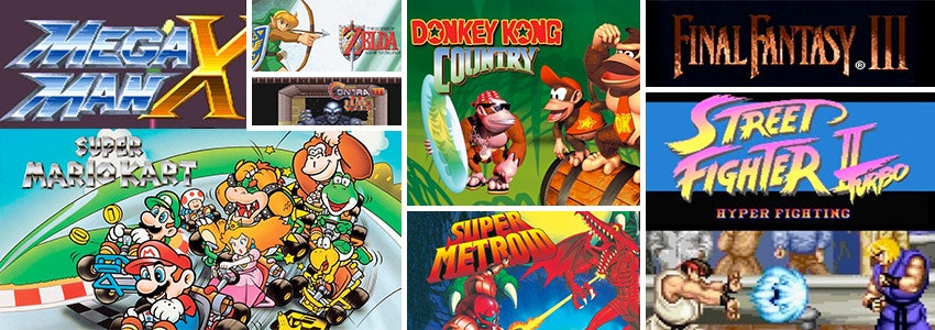 Contra III The Alien Wars (europäischer Titel: Super Probotector: Alien Rebels) • Donkey Kong Country • EarthBound • Final Fantasy III • F-Zero • Kirby Super Star (europäischer Titel: Kirby’s Fun Pack) • Kirby’s Dream Course • The Legend of Zelda: A Link to the Past • Mega Man X • Secret of Mana • Star Fox (europäischer Titel: Starwing) • Star Fox 2 • Street Fighter II Turbo: Hyper Fighting • Super Castlevania IV • Super Ghouls ’n Ghosts • Super Mario Kart • Super Mario RPG: Legend of the Seven Stars • Super Mario World • Super Metroid • Super Punch-Out!! • Yoshi’s Island