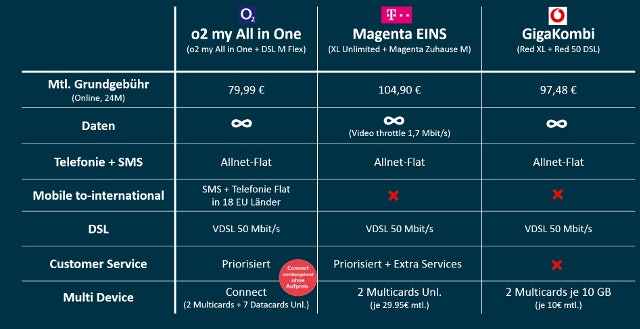 Für knapp 80€ monatlich ist der unlimitierte o2-Tarif o2 All in One buchbar – zu den oben genannten Tarifdetails profitiert man bei diesem Modell zusätzlich von einem Festnetzanschluss sowie einer Telefon- und Internetflat mit einer Geschwindigkeit von bis zu 50 Mbit/s. Außerdem hat man die Möglichkeit, durch das 24 Monate gratis verfügbare o2 Connect bis zu 10 zusätzliche SIM-Karten zu nutzen.
