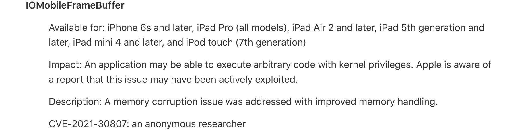 Eine entscheidende Sicherheitslücke im IOMobileFrameBuffer, die ebenfalls mit dem Update behoben wurde, betrifft nicht nur iPhones, sondern auch iPads und Mac. Angreifer hatten mit der Lücke und durch eine auf dem Gerät installierte App die Möglichkeit, beliebige Schad-Codes mit Kernel-Privilegien auszuführen. Auch macOS Big Sur 11.5.1 behebt diesen Fehler. Ob und inwieweit ältere macOS-Versionen von dem Fehler betroffen sind, ist noch nicht bekannt. Ebenso wenig gibt es Informationen darüber, ob es bei dem Bug womöglich Zusammenhänge mit der Pegasus-Spyware gibt, oder ob es sich um ein ganz anderes Problem handelt.