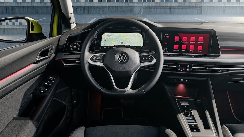 Völlig anders als der Golf 7 zeigt sich der Innenraum des neuen Golf 8. Die klassischen Rundinstrumente hat VW gestrichen. Alle Infos gibt es stattdessen auf zwei Displays. Über das Lenkrad lassen sich dort auf dem zentralen Bildschirm die wichtigen Fahrzeugdaten anzeigen. Das Display auf der rechten Seite ist für das Infotainment-System zuständig. Auf Wunsch ist auch ein Head-up-Dispaly verfügbar.