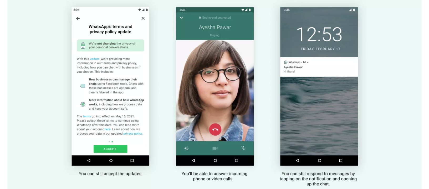Auf kurz oder lang wird es für ABG-Verweiger:innen aber dazu kommen, dass das Kommunizieren mit WhatsApp nicht mehr in dem gewohnten Umfang möglich sein wird. Nach dem Inkrafttreten der neuen Bestimmungen werde es weiterhin Erinnerungen zur Zustimmung geben, die „nach Ablauf einiger Wochen“ als permanenter Hinweis in der App erscheinen. Dieser verhindert dann den vollen Zugriff auf Kontakte und Chats und zwingt Nutzer:innen dann, entweder zuzustimmen, oder alternativ den Messenger zu wechseln. Um wie viele Wochen es sich genau handeln wird, bis jener Hinweis aufploppt, ist jedoch unklar.