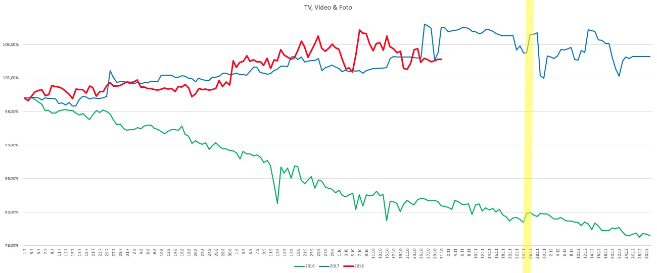 Die Prognose für 2018: Der Preis für den Bereich TV, Video und Foto wird zum Black Friday sinken, die besten Angebote finden sich jedoch am Tag davor.