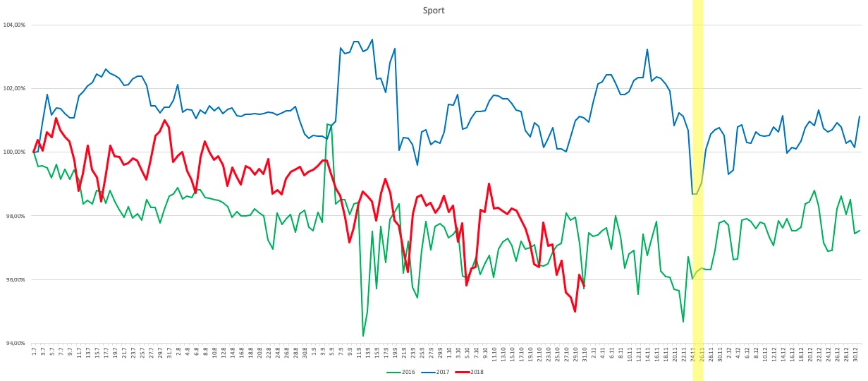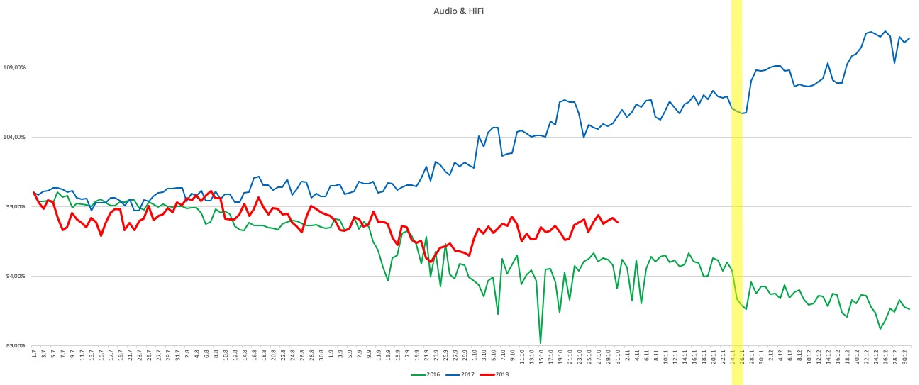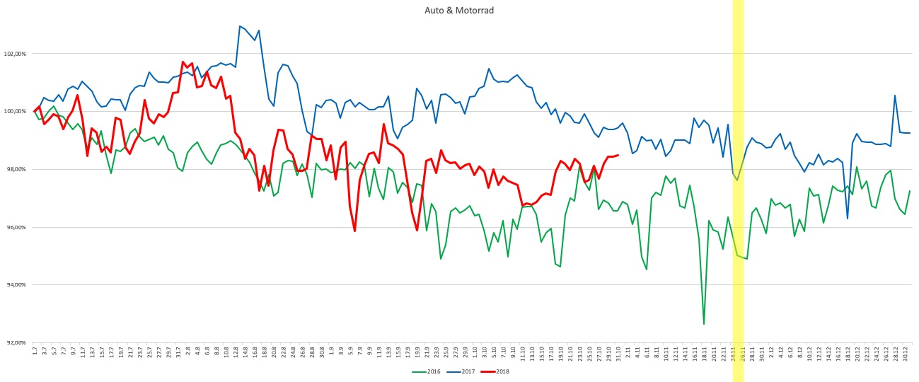 Der Indexverlauf der Jahre 2016 und 2017 zeigt ein deutlich nachlassendes Preisniveau in der Zeit um den Black Friday. 2016 war der niedrigste Stand zwei Tage vor dem eigentlichen Shopping-Event erreicht. Im letzten Jahr war genau die Zeit um den Schwarzer Freitag die Phase mit dem niedrigsten Indexwert für das zweite Halbjahr. Übereinstimmend zog das Preisniveau danach an.
