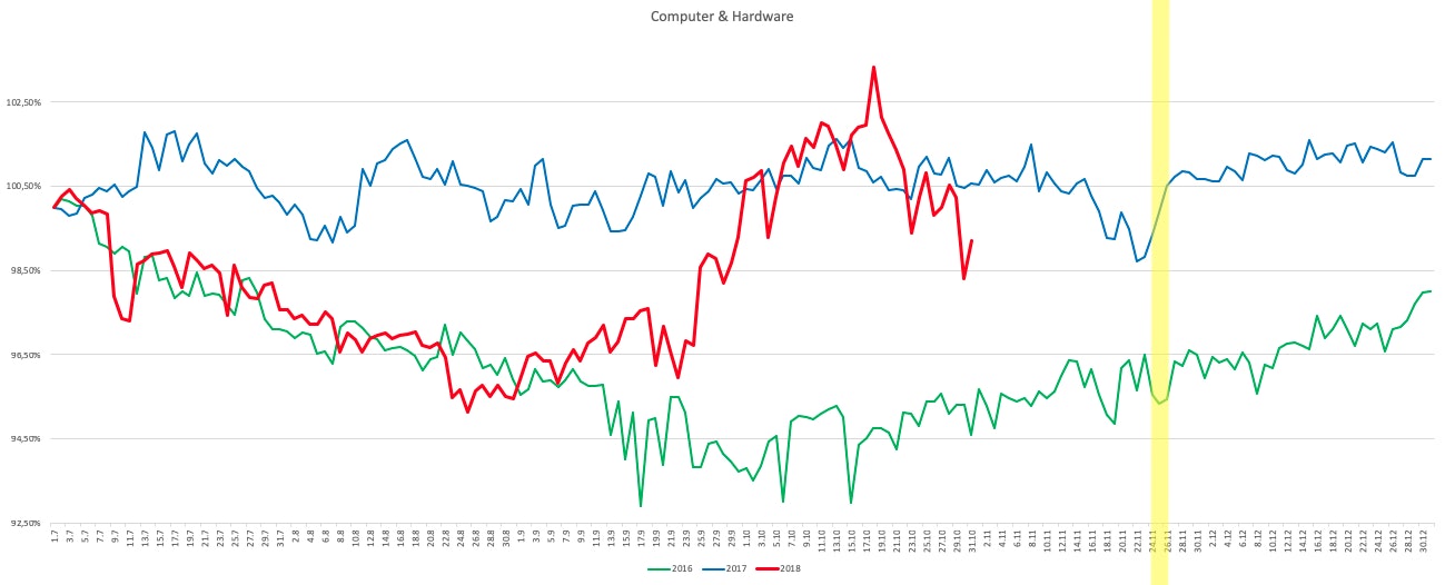 Die Prognose für 2018: Zum Black Friday hin sinken den Hardwarepreise. Die besten Schnäppchen können aber auch schon in den Tagen vorher zu finden sein.