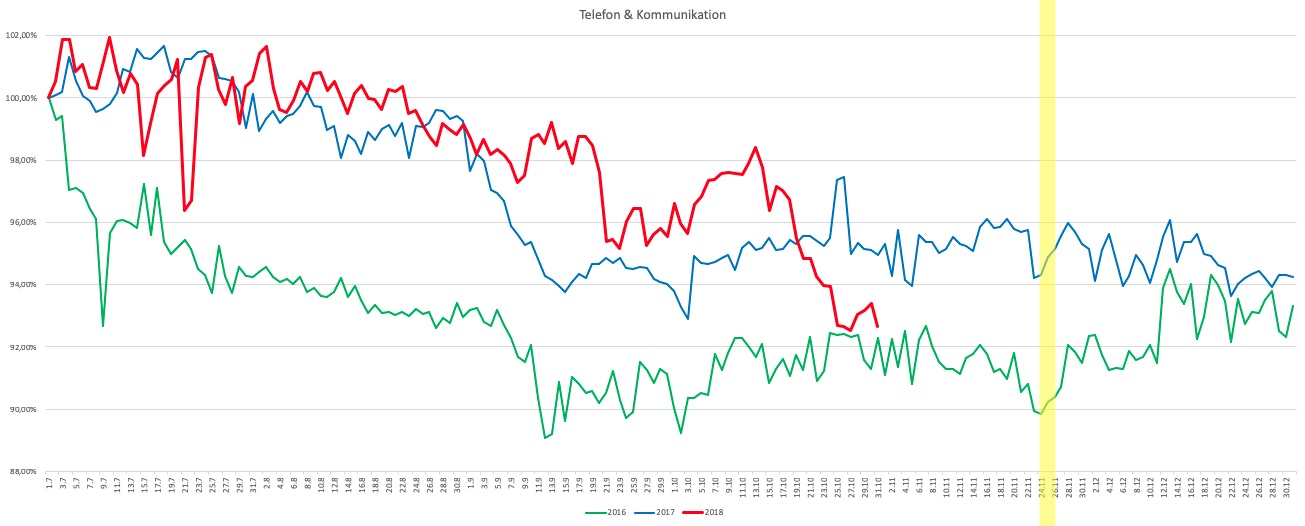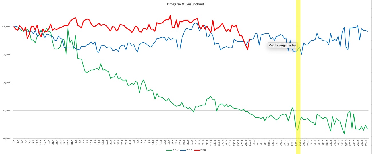 Als Grundlage für den Preischeck wurde das zweite Halbjahr 2016 und 2017 untersucht. Dazu kommt der Zeitraum vom Juli bis Oktober 2018. Für das Jahr 2016 lagen 18.500 Datensätze, für das Jahr 2017 24.000 Datensätze zugrunde. Mit Preispunkten für jeden Tag ergaben sich für 2016 3.385.000 Datenpunkte. Für 2017 lagen 4.392.000 einzelne Preispunkt vor. Basis für das Jahr 2018 waren 51.500 Datensätzen mit 6.283.000 Preisen für jeden Tag des Beobachtungszeitraums vor. Hier wurden allerdings nur die Top 50 Produkte berücksichtigt. Der Indexverlauf für 2018 berücksichtig so 67.100 Datenpunkte. Den tagesaktuellen Indexverlauf zeigen die Grafiken.
