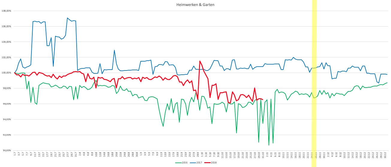 Auch wenn sich um den Black Friday herum in den letzten beiden Jahren eine kurze Schwäche der Indizes zeigt, ist der letzte Freitag im November für Einkäufe im Bereich Heimwerken und Garten eine weniger gute Shopping-Zeit. Der Indexverlauf für 2016 und 2018 legt nahe, dass der Herbstbeginn in der zweiten Jahreshälfte der bessere Kaufzeitpunkt ist. Gerade für Gartenbedarf ist dann eine sehr wettbewerbsintensive Zeit. Zum Black Friday sind Schnäppchen hier nicht ausgeschlossen, vor allem, wenn der Käufer Glück mit seinem Wunschprodukt hat – bei Werkzeug ist das wahrscheinlicher als bei Gartenbedarf.