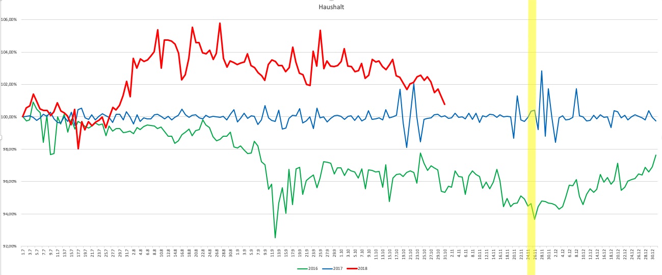 Die Betrachtung der Indexverläufe der vergangenen Jahre zeigt ein uneinheitliches Bild. Im Jahr 2017 war der Indexwert der beliebtesten Haushaltsgeräte sehr stabil. Für 2016 zeigt sich ein nachgebender Index ab dem September. In den beiden Jahren wies die Zeit um den letztern Freitag im November einen Preisrückgang auf. Ganz deutlich zeigt sich dieser Ausschlag im Jahr 2016. Im vergangenen Jahr waren der Indexwert an den auf den Schwarzen Freitag folgenden Tagen teilweise niedriger.