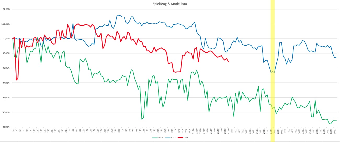 Der Index 2016 zeigt einen besseren Zeitpunkt: Das Wochenende – eben dann, wenn die Eltern Zeit haben Weihnachtsgeschenke zu shoppen oder man in Ruhe die neue Drohne kauft. Auch 2017 war das Wochenende zwischen Black Friday und Cyber Monday der beste Zeitpunkt für den Spielwaren-Einkauf. Im vergangenen Jahr erreichte der Index zu diesem Zeitpunkt den niedrigsten Wert. Während 2017 das Preisniveau weiter sank, zog es im letzten Jahr zu Weihnachten wieder an.