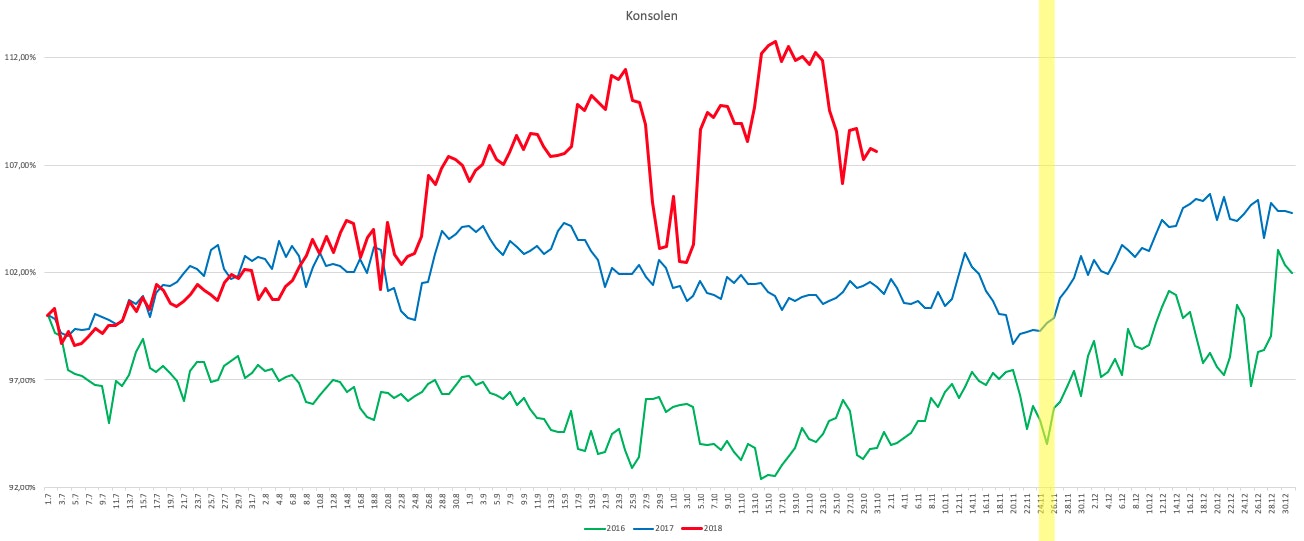 In den letzten beiden Jahren kamen mit der Playstation 4 Pro, der Xbox One X und der Nintendo Switch neue Konsolen auf den Markt. Bundles mit attraktiven Spielen machen den Umstieg auf die neuen Konsolen reizvoll. Für die Händler und Hersteller bedeuten die neuen, aber auch höherpreisigen Konsolen mehr Umsatz. Das zeigt sich im Indexverlauf für 2018. Während die Preisentwicklung in den Jahren 2016 und 2017 sehr parallel verlief, weicht das Preisniveau für das aktuelle Jahr deutlich nach oben ab. Was bedeutet das für das große Shopping-Event im November?