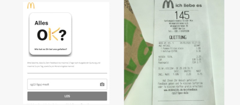 Auf der Feedbackseite der beliebten Fastfood-Kette bewertet ihr anschließend euren Besuch und ladet entweder ein Foto eurer Rechnung hoch oder gebt den Code ein, welchen ihr darauf findet.