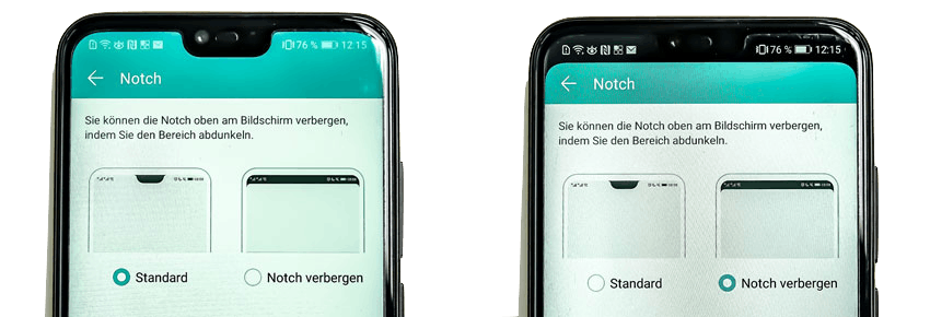 Charakteristisch zeigt sich beim Display des Honor 10 die Aussparung für Sensoren und Hörmuschel. Das Display wird seitlich dieser sogenannten Notch nach oben geführt. Mit dem iPhone X wurde dieses Merkmal hoffähig und ist seither bei zahlreichen Geräten zu sehen. Die Displayfläche wird dadurch vergrößert und es werden zusätzliche Infos angezeigt. Doch vielen Nutzer gefällt dieses Merkmal nicht. Beim Honor 10 haben sie die Wahl. In den Einstellungen lässt sich die Notch deaktivieren. Allerdings wird dieser Bereich nicht komplett schwarz, da dass Display noch leicht durchscheint.