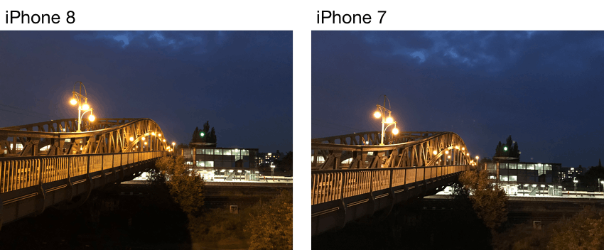 Am deutlichsten zeigen sich die Verbesserungen des iPhone 8 bei Nachaufnahmen. Bei unveränderter Blende nimm der vergrößerte Sensor mehr Licht auf. Dadurch wirken die Aufnahmen heller. Das fällt schon direkt beim Fotografieren auf dem Display auf. Auch hier zeigt das Foto leichtstärkere Farben und mehr Details. Apple verwendet dazu einen schnelleren Autofokus.