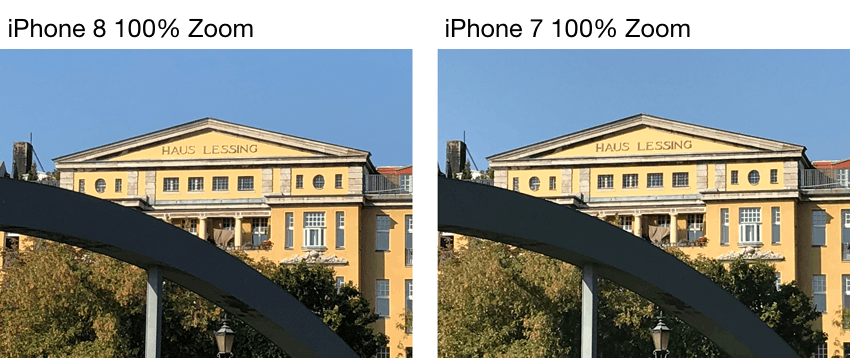 Auch beim Zoom zeigen sich kräftigere Farben auf den Bildern. Die Bildstabilisierung, die beim iPhone 8 durch die Software erledigt wird, ist beim Fotografieren selbst deutlich besser. Details wirken schärfer, auch wenn das Ergebnis bei voller Vergrößerung weiter Schwächen zeigt.