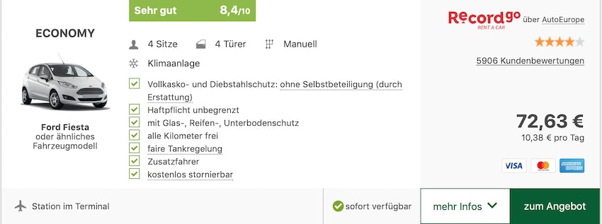 Diese Vergleichsportale umfassen auch Angebote sogenannter Mietwagen-Broker oder Veranstalter. Diese kaufen oft große Kontingente bei Anbietern (z.B. Europcar) ein und vermieten diese an euch weiter. Auch die dadurch entstandenen großen Rabatte werden an euch weitergegeben. Oft könnt ihr außerdem von einem besseren Service profitieren. In diesem Beispiel seht ihr im rechten oberen Eck, dass ihr das Fahrzeug über den Mietwagen Broker AutoEurope bucht.