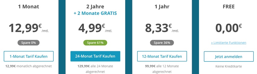 12,99€ pro Monat 1-Jahres-Paket 8,33€ pro Monat (99,99€ jährlich) 2-Jahres-Paket 4,99€ pro Monat (129,99€ alle 2 Jahre) |