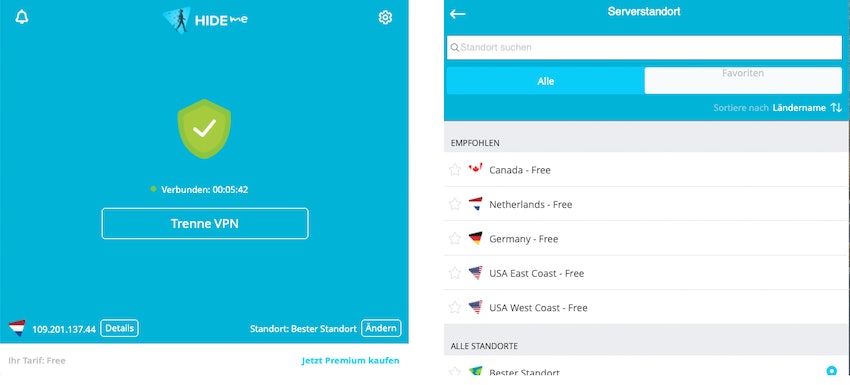 Nutzen lässt sich Hide.me sogar kostenlos. Zumindest eingeschränkt. Gratis gibt es die Nutzung von fünf Server-Standorten mit maximal einer Verbindung und einer Begrenzung auf zwei Gigabyte pro Monat. So kann Hide.me. einfach und recht ausführlich getestet werden Den vollen Umfang bekommen Nutzer über das Abo. Beim 2-Jahres-Paket werden monatlich 4,99 Euro fällig. Das Jahres-Paket wird mit 8,33 Euro im Monat berechnet. Wer lieber monatlich kündigen möchte zahlt 12,99 Euro.