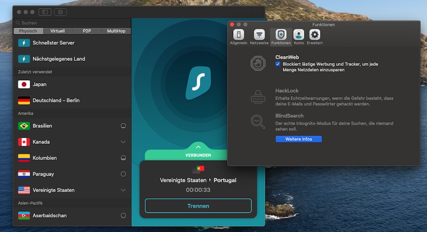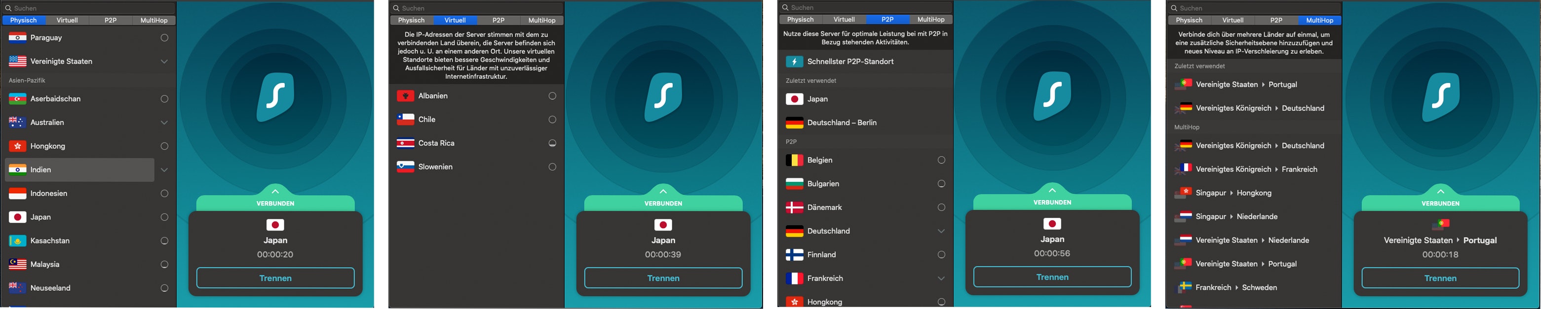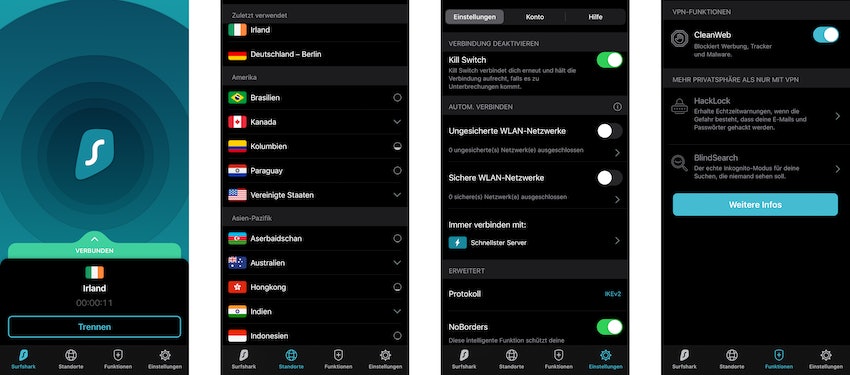 Surfshark bietet ein VPN mit vielen Funktionen zu einem günstigen Preis. Die wesentlichen Funktionen sind im Preis inbegriffen. Der Kill Switch schützt eure Datenverbindung auch dann, wenn die Verschlüsselung abbrechen sollte. Die IP wird von einem eigenen Server vergeben. So solchen IP- und DNS-Keck verhindert werden. Um zusätzliche Anonymität zu erhalten sendet Surfshark eure Daten über Server verschiedener Länder. So soll eure Herkunft verschleiert werden.
