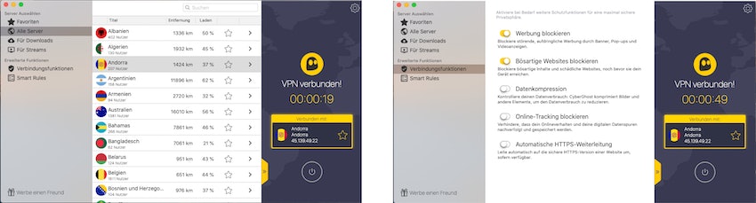 Der von Cyberghost angebotene Funktionsumfang ist im Vergleich zu den anderen Anbietern übersichtlich. Der Kill Switch unterbricht die Verbindung, sobald das VPN abbrechen sollte. Darüber hinaus finden Anwender bei Cyberghost P2P-Unterstützung und Schutz vor IP-Leaks. Damit ist die Liste an besonderen Features bei Cyberghost fast schon vorbei. Der Anbieter konzentriert sich auf den Kern eines VPN.