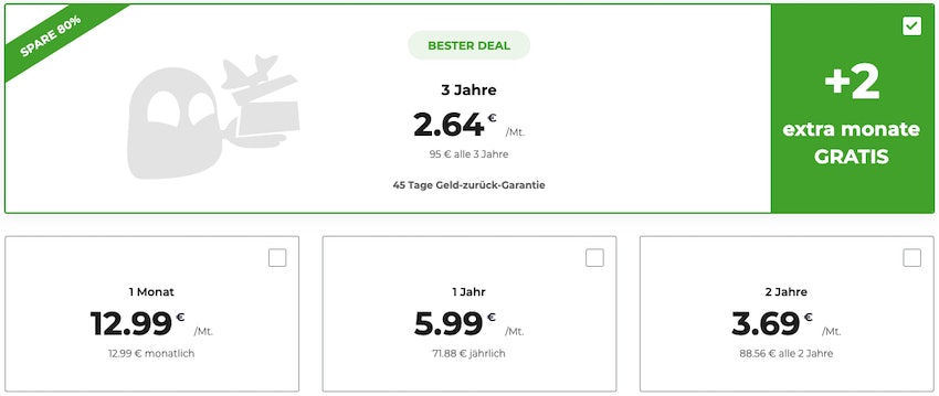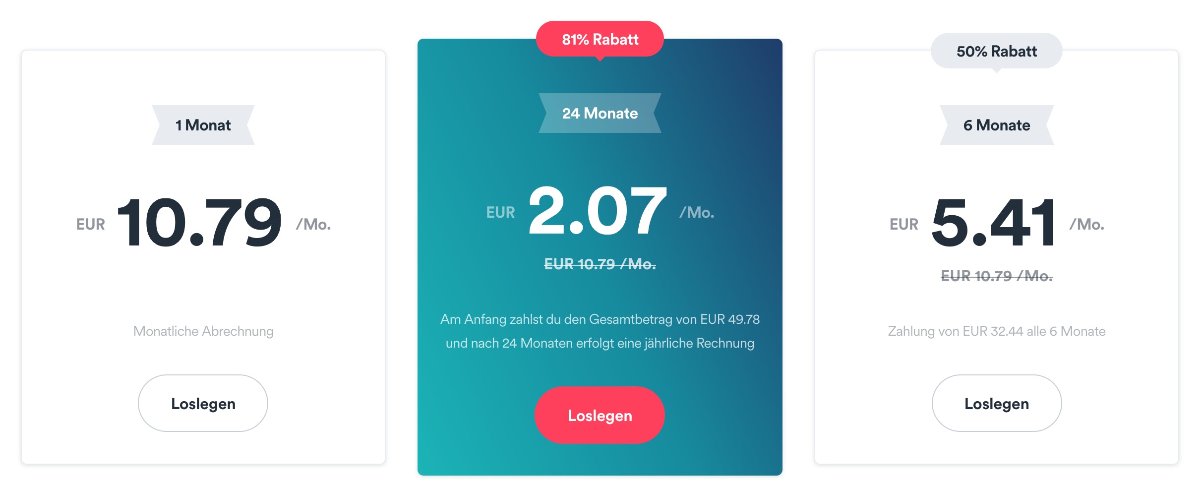 12,99€ pro Monat 1-Jahres-Paket 5,99€ pro Monat (71,88€ jährlich) 2-Jahres-Paket 3,69€ pro Monat (88,56€ alle 2 Jahre) 3-Jahres-Paket 2,64€ pro Monat (95€ alle 3 Jahre) |