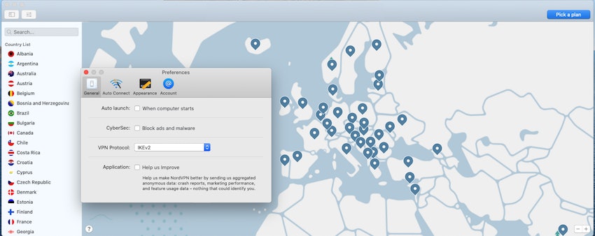 Die Vergabe von IP durch eigene Server gehört natürlich auch zum Leistungsumfang. Der Datenverkehr wird laut NordVPN „nach Militärstandard“ verschlüsselt. Klingt sehr sicher und ist gutes Marketing. Dahinter steckt der AES-Standard mit einem 256-Bit-Schlüssel. Als VPN-Protokoll verwendet NordVPN sowohl IKEv2/IPsec als auch OpenVPN. Open VPN ist das Standard-Protokoll für Windows, macOS und Android. Bei iOS und macOS wird steht IKEv2/IPsec bereit. So haben macOS-Nutzer den Vorteil, zwischen beiden Protokollen auszuwählen.