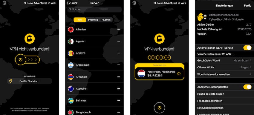 Für die Verschlüsselung verwendet Cyberghost wie alle anderen hier genannten Anbieter einen 256-Bit AES-Codierung. Als VPN-Protokelle sind OpenVPN, L2TP, IPSec, IKEv2 und PPTP vorhanden. Soweit, so unaufgeregt. Womit kann Cyberghost im Vergleich zu anderen VPNs punkten. Wird noch mehr Datenschutz, Sicherheit, Privatsphäre und Anonymität geboten?