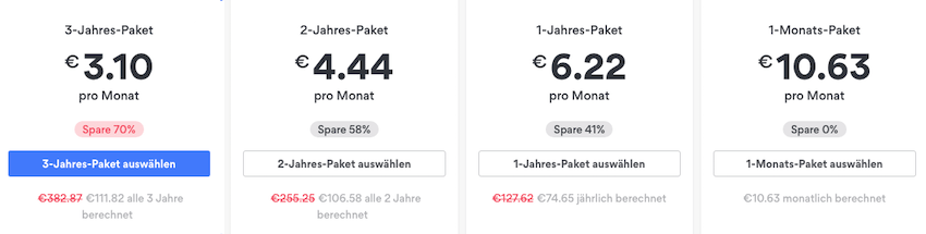 10,63€ pro Monat 1-Jahres-Paket 6,22€ pro Monat (74,65€ jährlich) 2-Jahres-Paket 4,44€ pro Monat (106,58€ alle 2 Jahre) 3-Jahres-Paket 3,10€ pro Monat (111,82€ alle 3 Jahre)