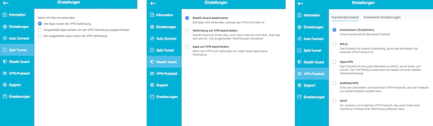 Mehr an Privatsphäre will Hide.me dennoch liefern. Dafür soll das Feature Stealth Guard sorgen. Dieses ist eine umgekehrte Whiteliste. So können bestimmte Anwendungen und Apps ausgewählt werden. Diese Apps sind dann nur über das VPN nutzbar. So verhindern Nutzer, dass sie versehentlich eine Verbindung ohne VPN-Schutz nutzen und dadurch eine verfolgbare Verbindung aufbauen.