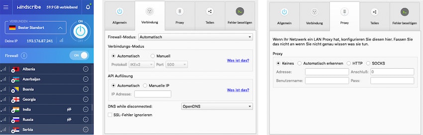 Wer schnell seinen Standort verschleiern will, kann das bei Windscribe mit dem Proxy tun. Wie auch bei Hide.me können so Blockaden umgangen werden ohne das die Geschwindigkeit negativ beeinflusst wird.